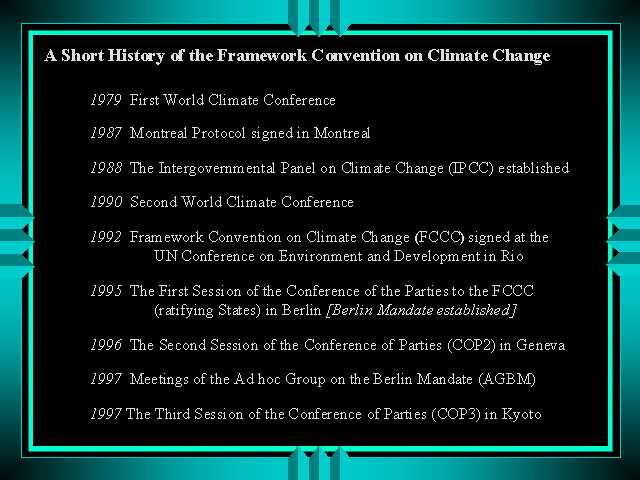 1992 FCCC is the ‘parent’ treaty of the Kyoto Protocol. It was signed by 169 countries. More to come on this in the next slide.