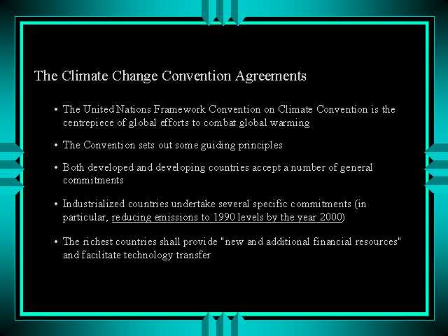 - OECD + states of Central and Eastern Europe will adopt policies and measures aimed at returning emissions to 1990 levels by the year 2000